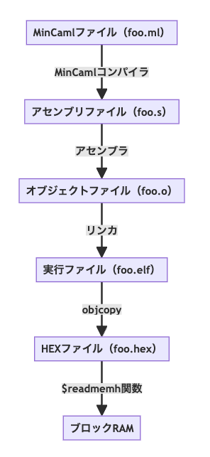 MinCamlで書かれたプログラムを、自作CPUへ組み込む流れは、こんな感じです。 * MinCamlのプログラムをコンパイルして、アセンブリファイルを生成し、 * アセンブリファイルをアセンブルして、オブジェクトファイルを生成し、 * オブジェクトファイルをリンカにかけて、ELFフォーマットの実行ファイルを生成し、 * objcopy コマンドを使って、実行ファイルから、プログラムとデータを抽出して、HEXファイルとして保存し、 * 最後に、Verilog の $readmemh 関数を使って、FPGAの ブロックRAM を HEX ファイルで初期化します CPUを起動すると、ブロックRAMに書き込まれたプログラムが読み込まれ、実行されます。