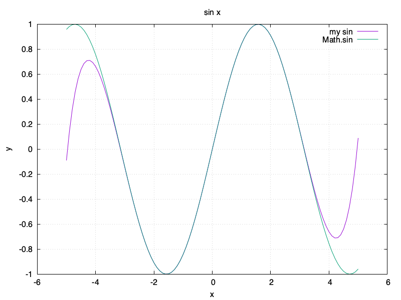 マクローリン展開で求めたsinやcosは、xの値が0から離れるほど誤差が大きくなります